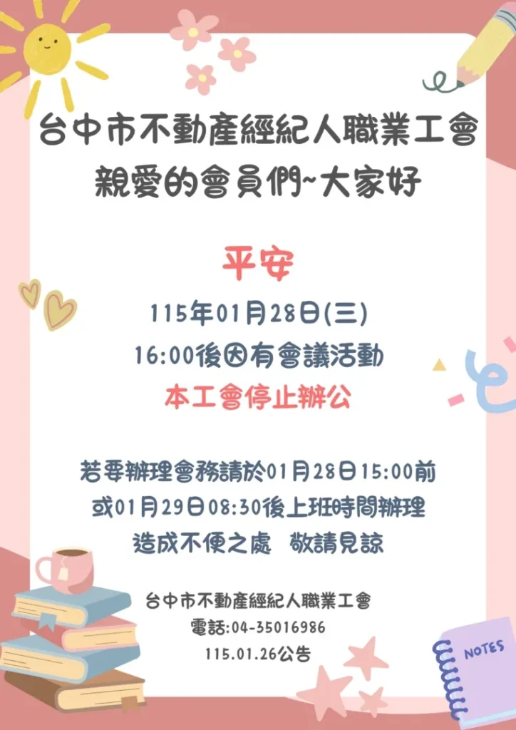 公文專區hi~您好,這裡提供 工會所有過往公文訊息,想要找找過去公佈的資訊?可以在這裡找到! 工會公告 ( 過往所有資訊 ) 公文專區 這裡會存放所有越來越多的公告,方便存查舊資訊! 公開資訊 公開內容營業時間異動公告更新於: 1 月 26, 2026公開內容115年元旦假期 營業時間異動公告更新於: 12 月 26, 2025公開內容114年行憲紀念日假期 營業時間異動公告更新於: 12 月 19, 2025公開內容營業時間異動公告更新於: 10 月 27, 2025公開內容114年光復節連續假期 營業時間異動公告更新於: 10 月 20, 2025公開內容114年中秋節、雙十節連續假期 營業時間異動公告更新於: 9 月 30, 2025公開內容114年教師節連續假期 營業時間異動公告更新於: 9 月 23, 2025公開內容不動產經紀人輔導考照班-【不動產經紀人實務班】現已開放報名囉~!更新於: 7 月 29, 2025公開內容114年下半年勞動部補助課程已於114/07/04公告核班囉!更新於: 7 月 11, 2025公開內容營業時間異動公告更新於: 7 月 10, 2025公開內容114年端午節連續假期 營業時間異動公告更新於: 5 月 23, 2025公開內容五一勞動節營業時間異動公告更新於: 4 月 24, 2025公開內容營業時間異動公告更新於: 4 月 14, 2025公開內容114年清明假期 營業時間異動公告更新於: 3 月 28, 2025公開內容營業時間異動公告更新於: 3 月 14, 2025公開內容114年228和平紀念日 營業時間異動公告更新於: 2 月 25, 2025公開內容114 春節營業時間海報公告更新於: 1 月 20, 2025公開內容會員代表選舉停止辦公公告更新於: 1 月 6, 2025公開內容114年元旦假期 營業時間異動公告更新於: 12 月 27, 2024公開內容榮獲「113年度健保第二、三類中型投保單位評比」績優獎更新於: 12 月 23, 2024公開內容114年-繳費通知函更新於: 12 月 3, 2024公開內容114年-家豐保險通知函更新於: 12 月 3, 2024公開內容 | 會員活動115年度生態導覽教育一日體驗更新於: 2 月 2, 2026公開內容 | 會員專屬114年7-12月帳單、調薪、九九重陽、子女獎學金、模範勞工各式公文更新於: 5 月 29, 2025公開花絮 | 會員活動114年3月17日第六屆第1次會員代表大會更新於: 5 月 23, 2025 聯絡我們有任何想法嗎?可以直接聯絡我們,了解更多喔!
